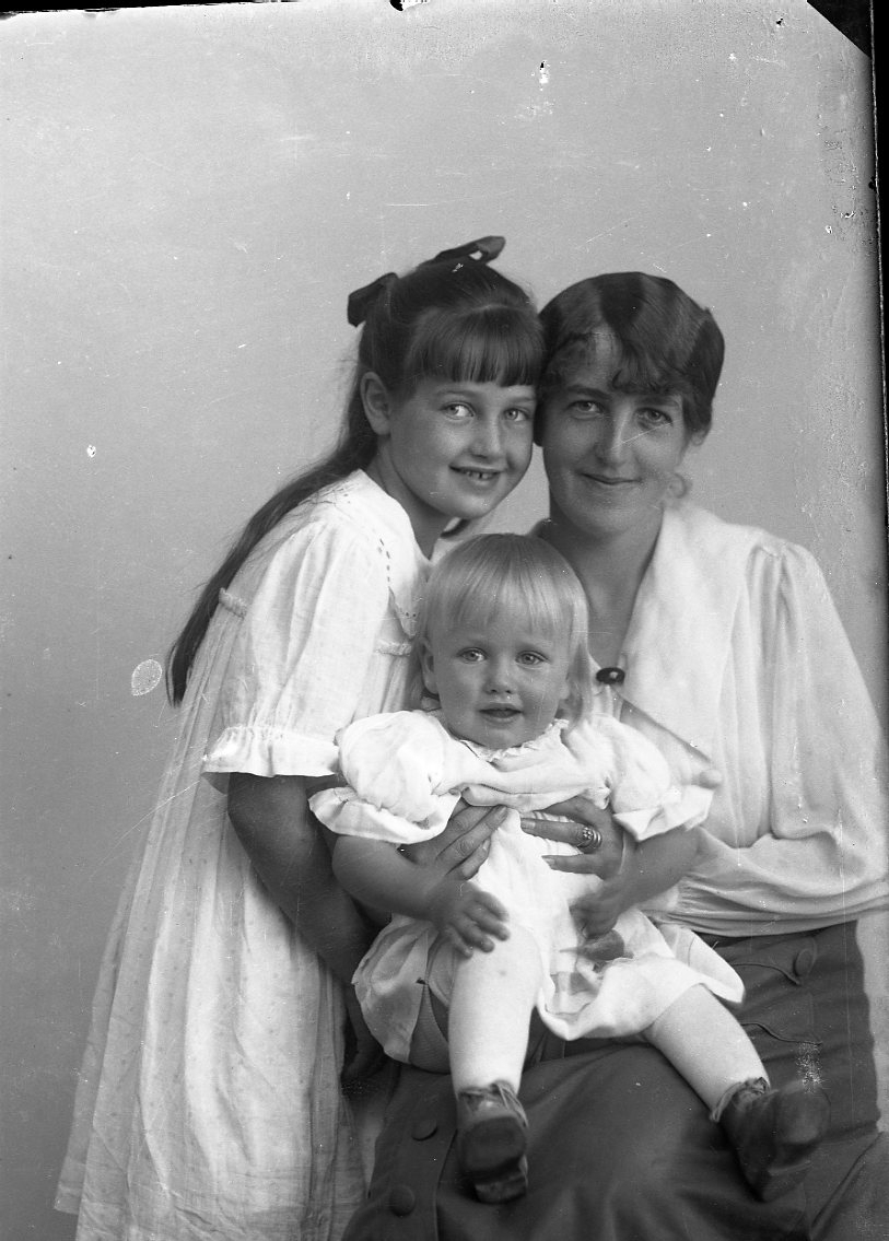 En kvinna sitter på en stol med två barn tätt intill sig, varav en flicka står intill och ett spädbarn i kvinnans knä. Kvinnan är fru Hård af Segerstad i Växjö.