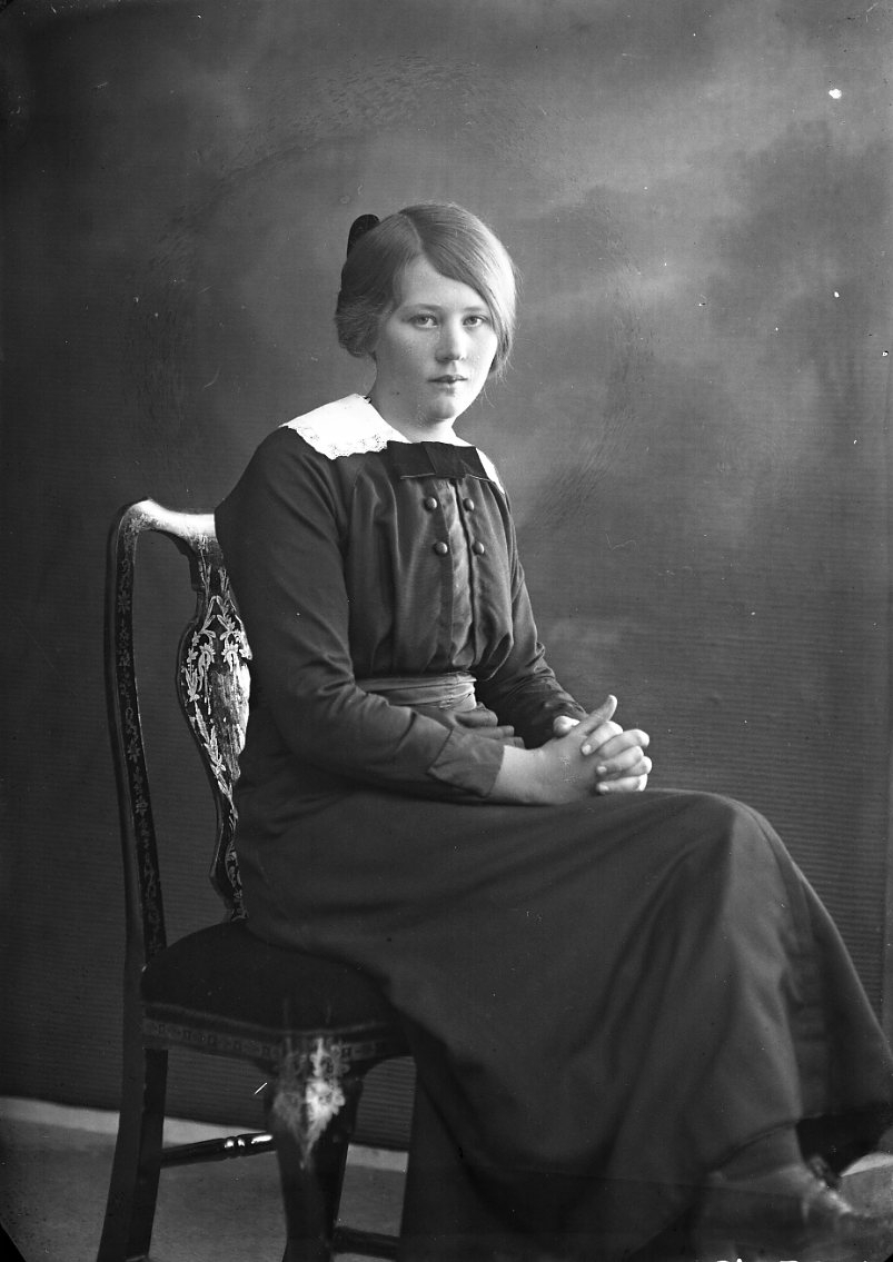 Porträtt av en flicka, Ester Johansson från Fallet. Hon sitter på en stol i 3/4-profil vänd mot fotografen med händerna knäppta i knät.