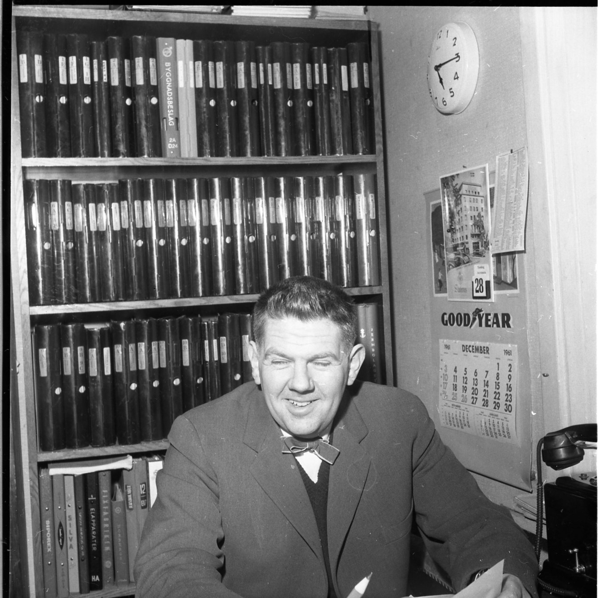 En man sitter på ett kontor. Bakom sig har han en bokhylla fylld med pärmar. Han ser glad ut.