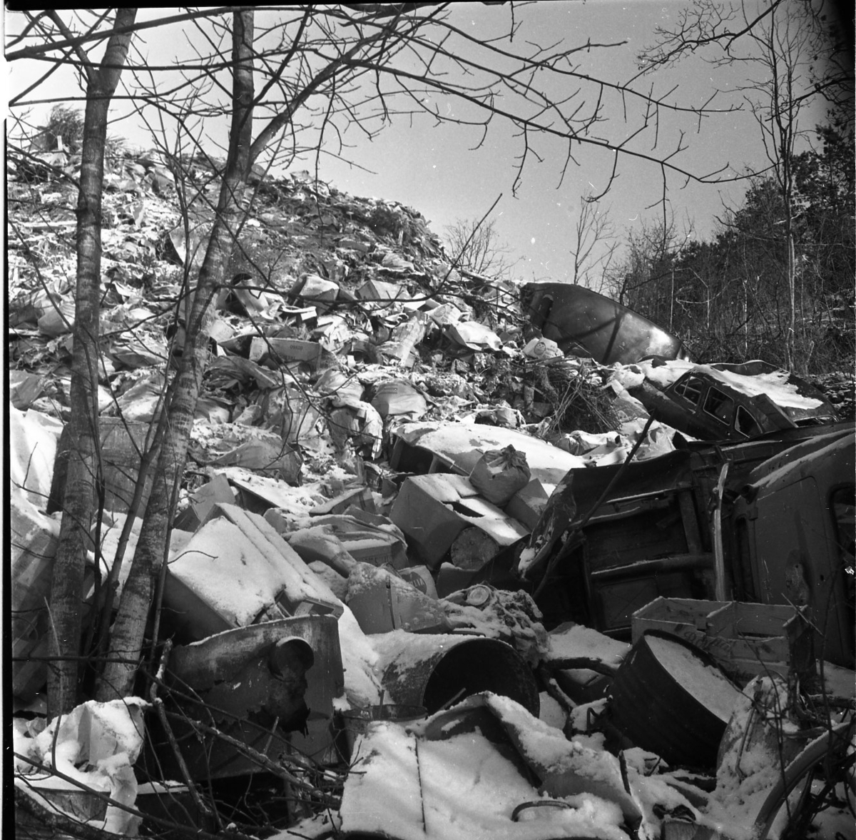 En slänt är täckt med hushållssopor. Även en gammal bil och en husvagn är dumpade på platsen.