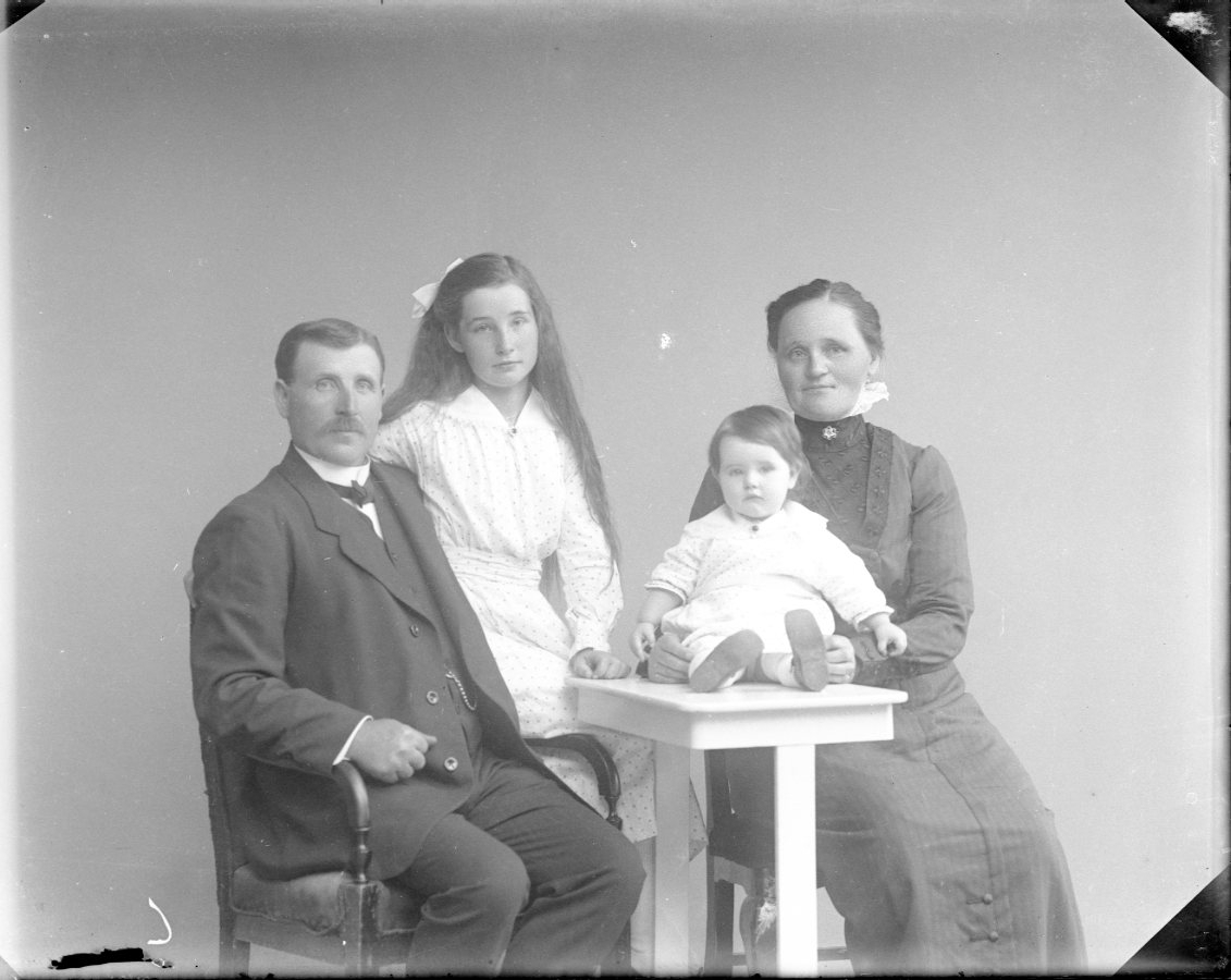 En man, en kvinna och två barn, den minsta sitter på ett bord.