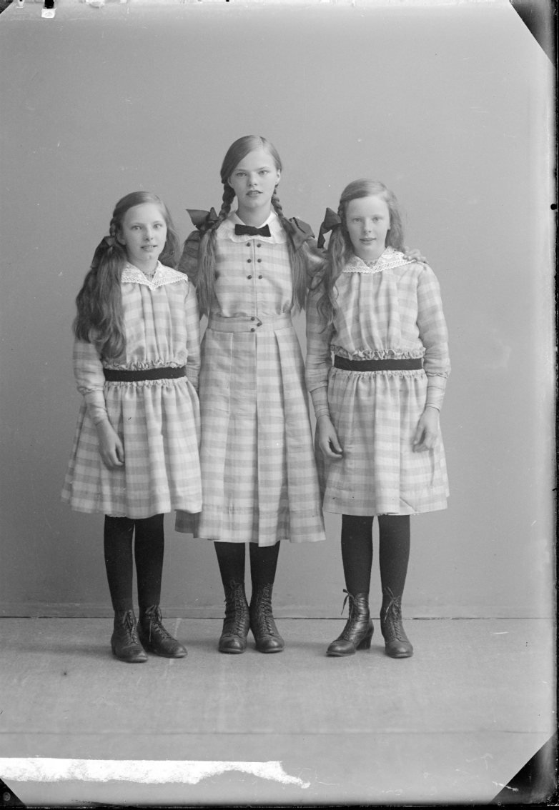 Gruppbild med tre flickor i rutiga klänningar av samma tyg, och rosett i håret. Syskonen Gustavsson.