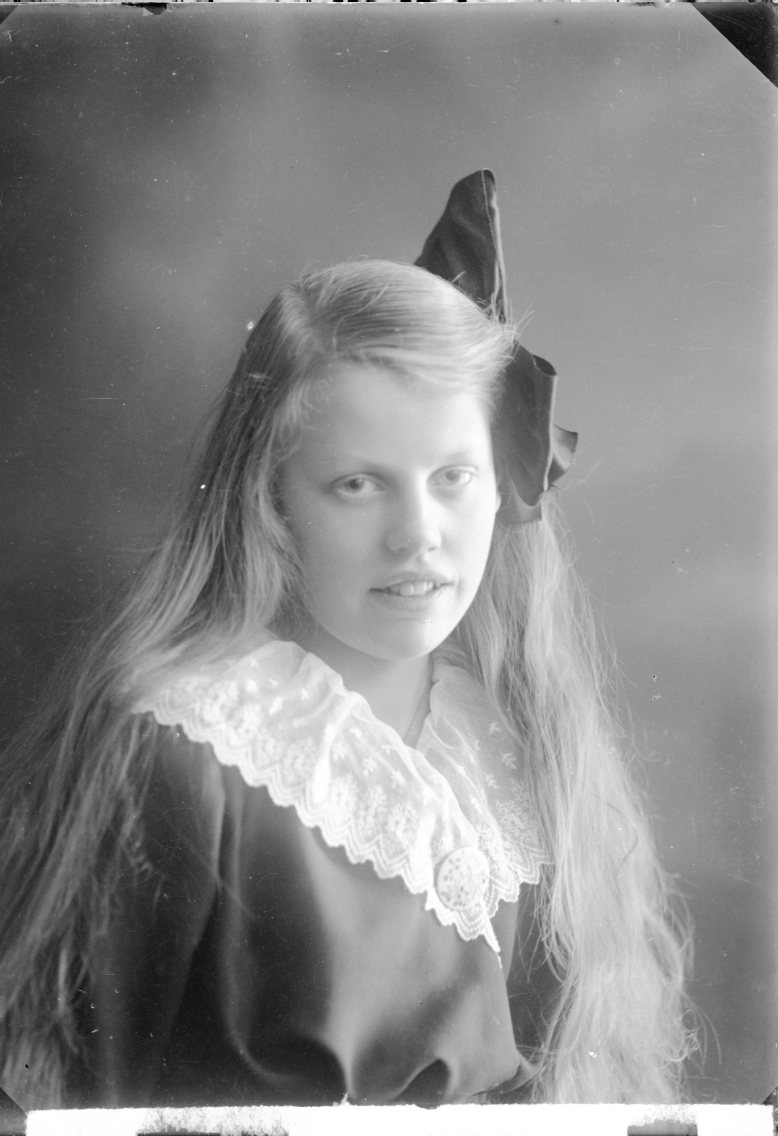 Bröstbild av en flicka med långt hår, rosett i håret och spetskrage - bröstbild.