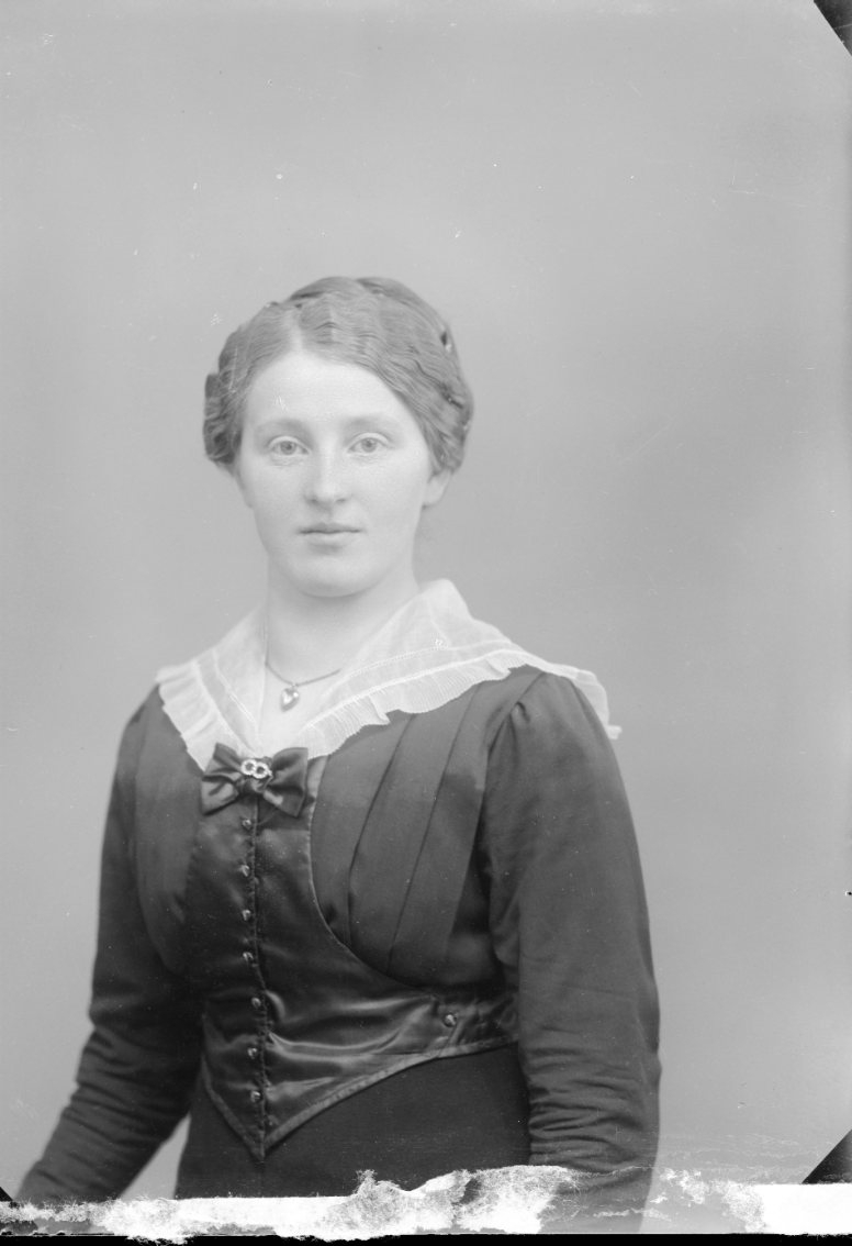 Porträtt av en ung kvinna med mörkt plisserat livstycke, blankt tyg i mittparti. Halssmycke i form av ett hjärta. Hon sitter på en stol.