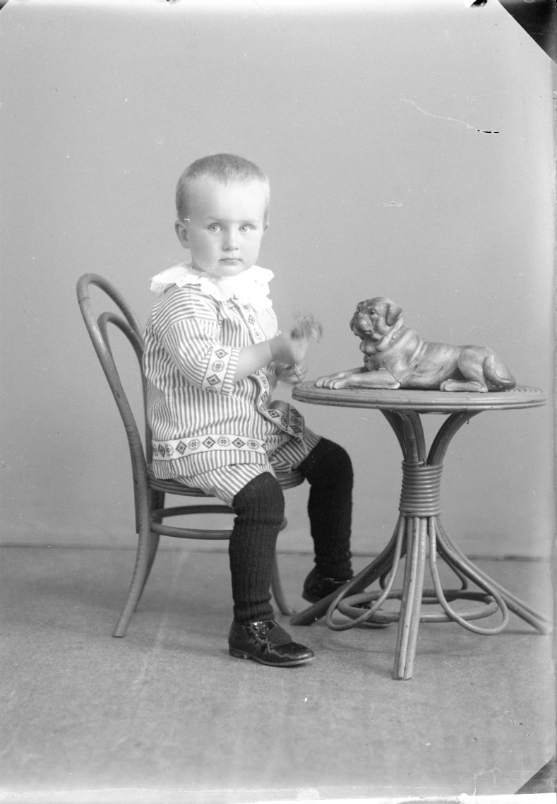 En liten pojke sitter vid en barnmöbel med en leksakshund på bordet, han håller något framför hunden.
