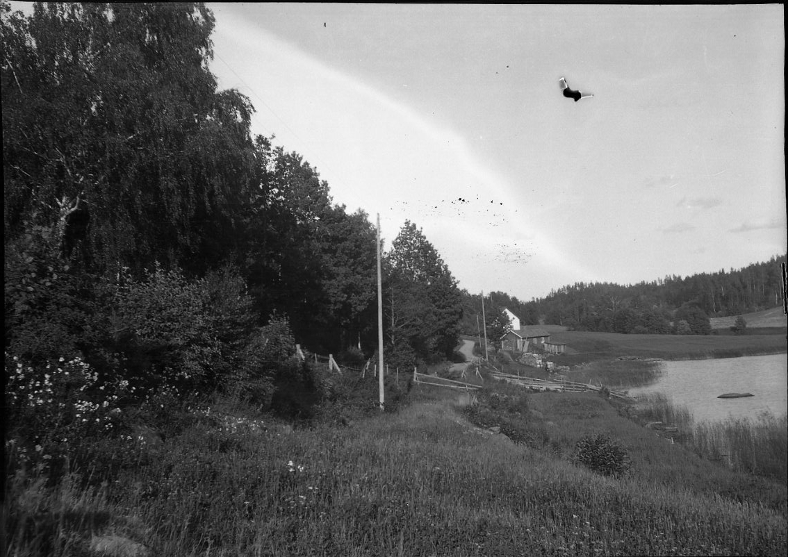 Landskap med en sjö till höger och några byggnader till vänster om sjön.