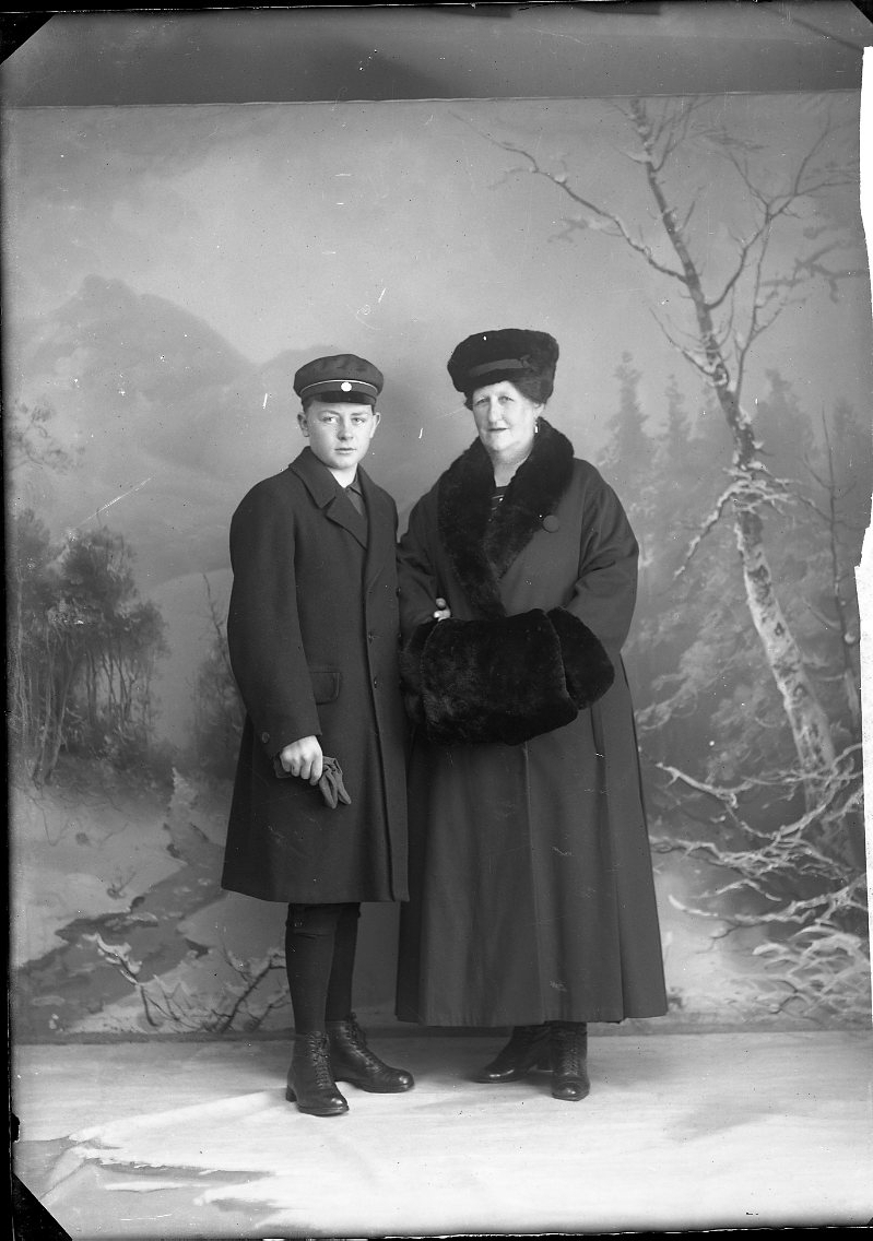 En äldre kvinna står intill en pojke. De har ytterkläder på sig, framför en vinterfond.