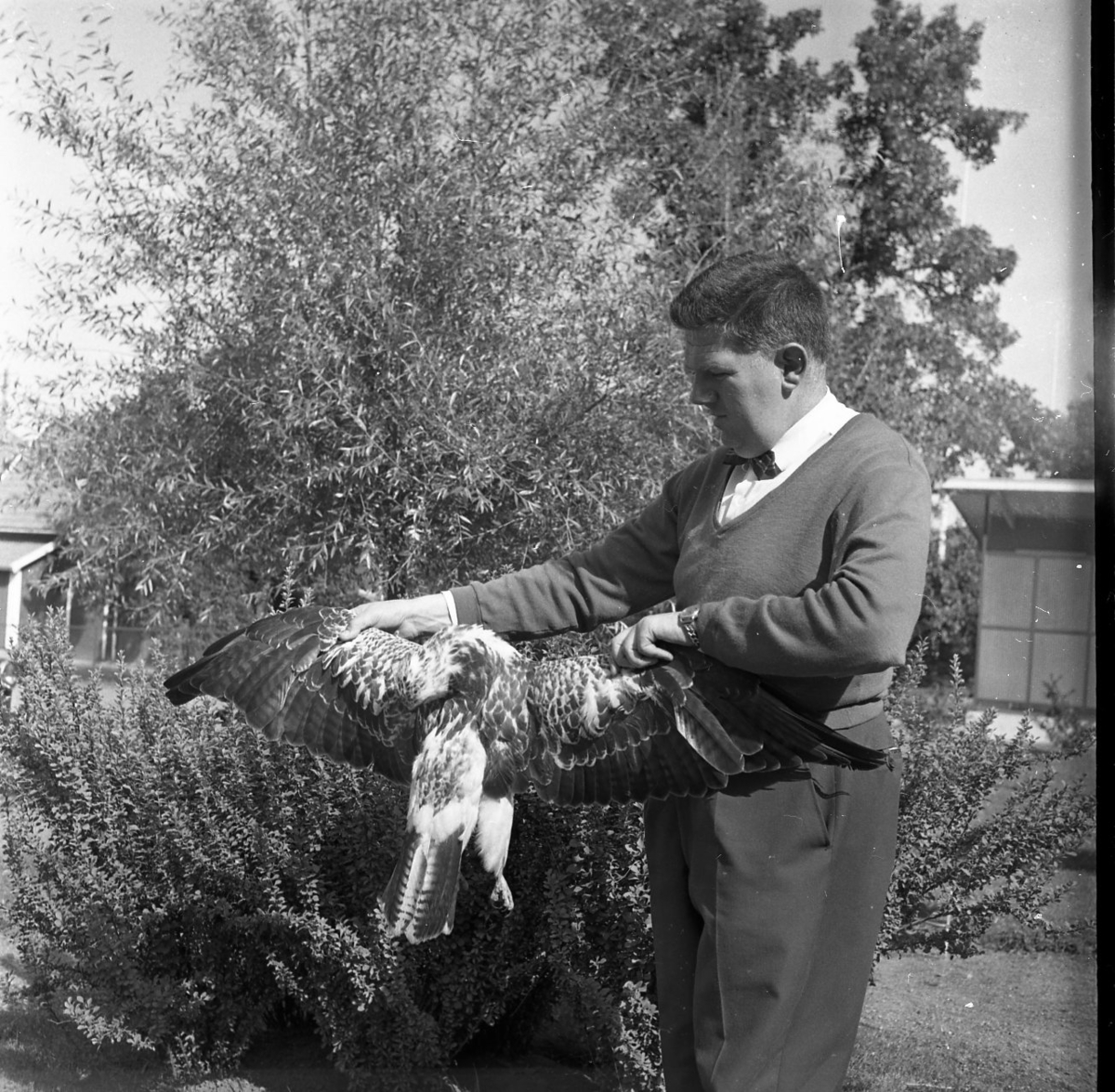 En man står och visar upp en rovfågel. Han breder ut fågelns vingar så att den blottar bröstet. Fågeln gömmer huvuden bakom en vinge.