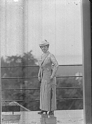 Fru Dargel från Kiel i randig dress, hatt och paraply i handen. Hon står sannolikt på balkongen till Calla Sundbecks ateljé.
