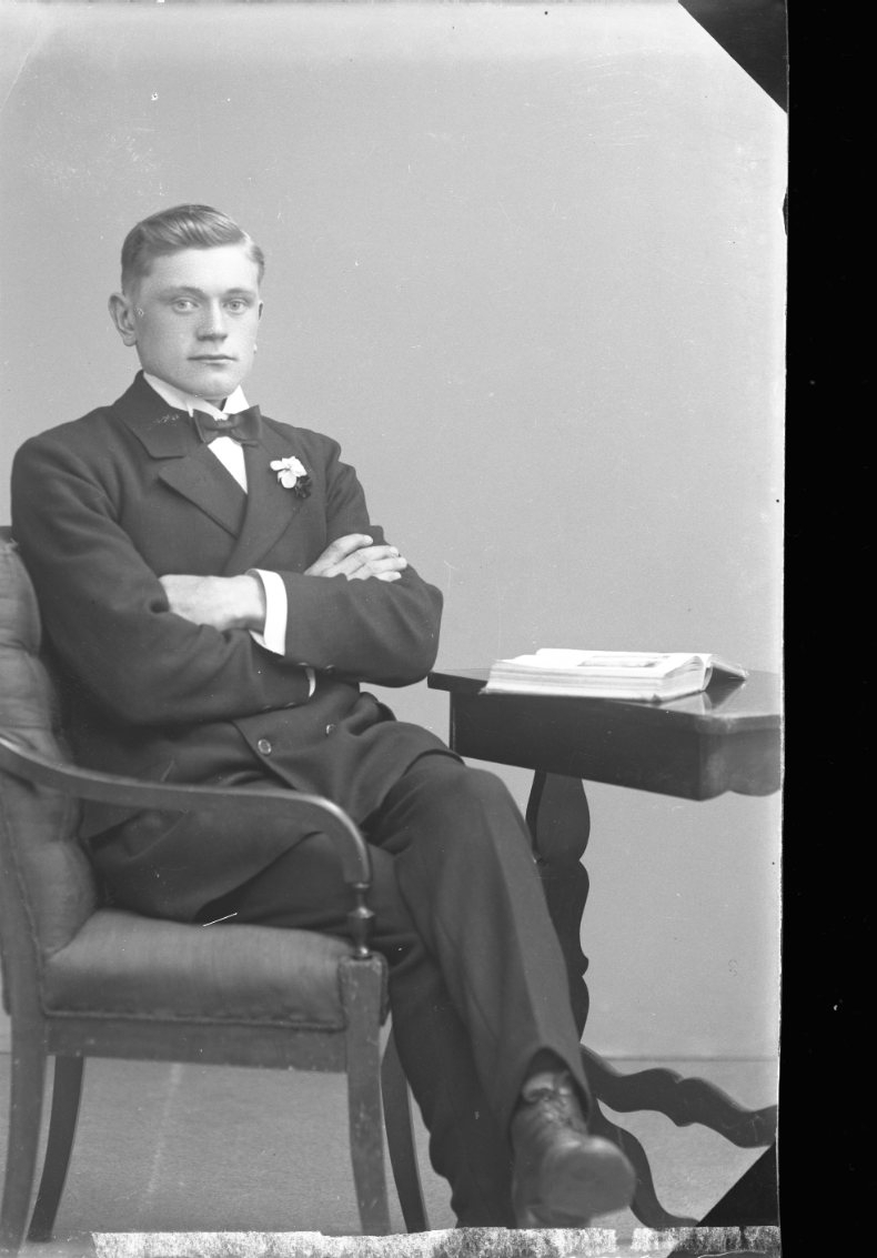 Bröstbild av en sittande ung man, med blomma i kavajslaget. Han sitter med armarna i kors vid ett bord där en bok ligger uppslagen.