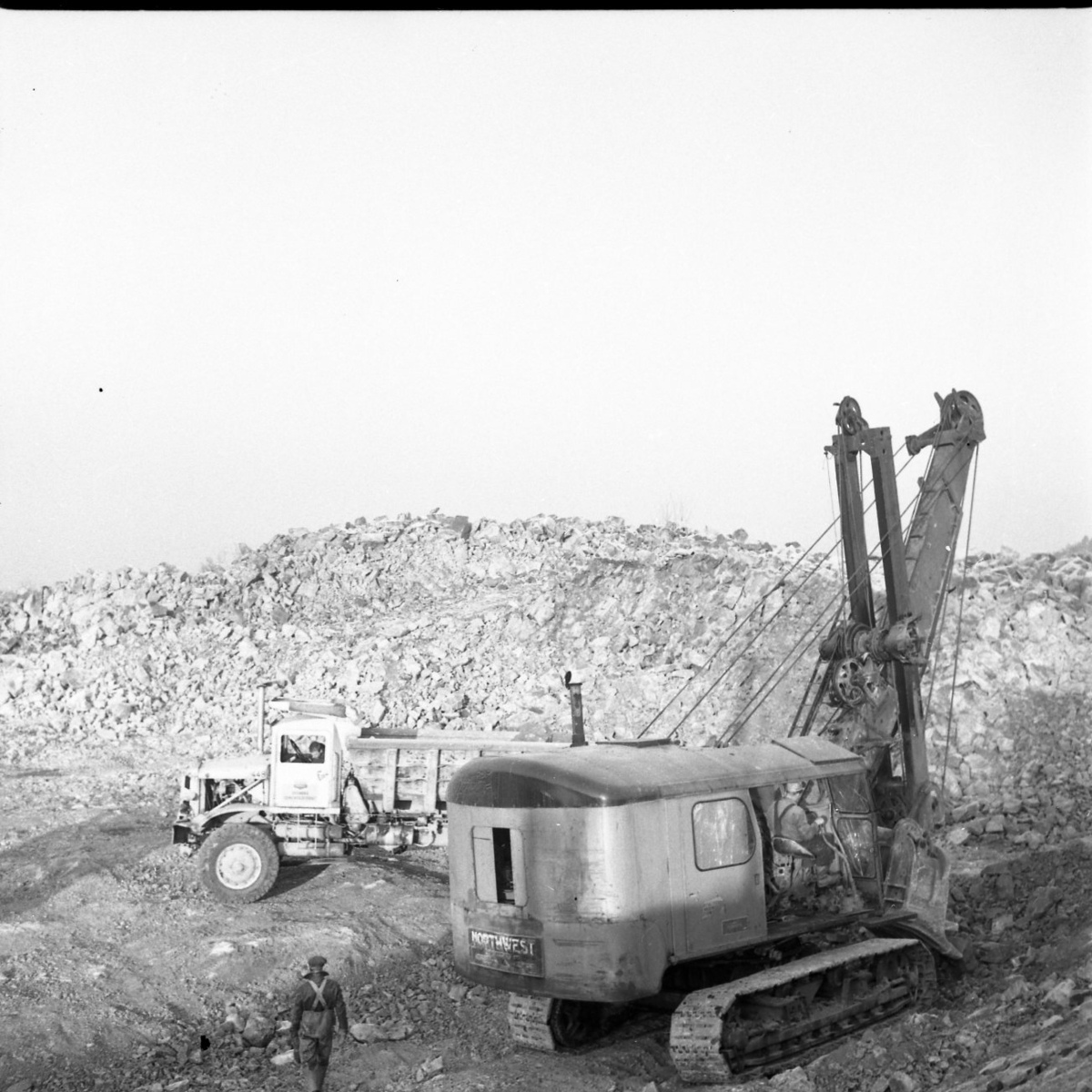 Bergrensning. En arbetare sitter i en grävmaskin som lastar upp bergrester på ett flak.