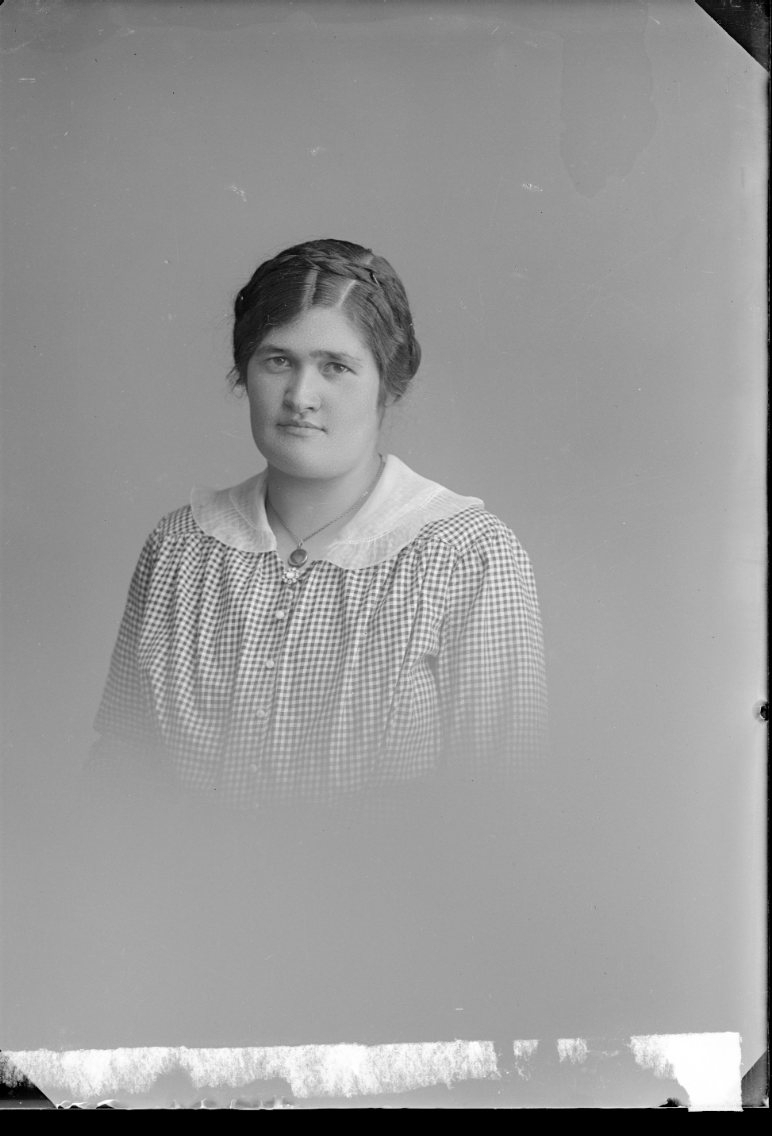 Porträtt av en ung kvinna i smårutig klänning med vit krage.