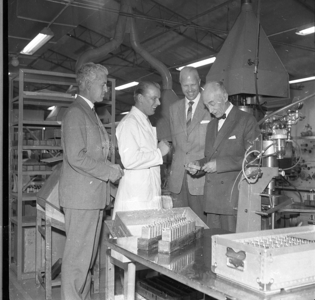 Fyra män samlade vid en arbetsstation på Rifa-fabriken i Gränna. De är från vänster: K Mörner, möjligen platschef B Arding, direktör T Skytt och troligen landshövding A Nordenstam.