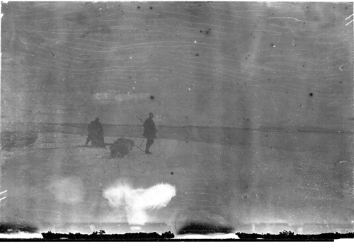 Oretuscherad. Isvandringen. Möjligen S A Andrée till vänster och Knut Fraenkel till höger, inför passage av större öppet vatten.