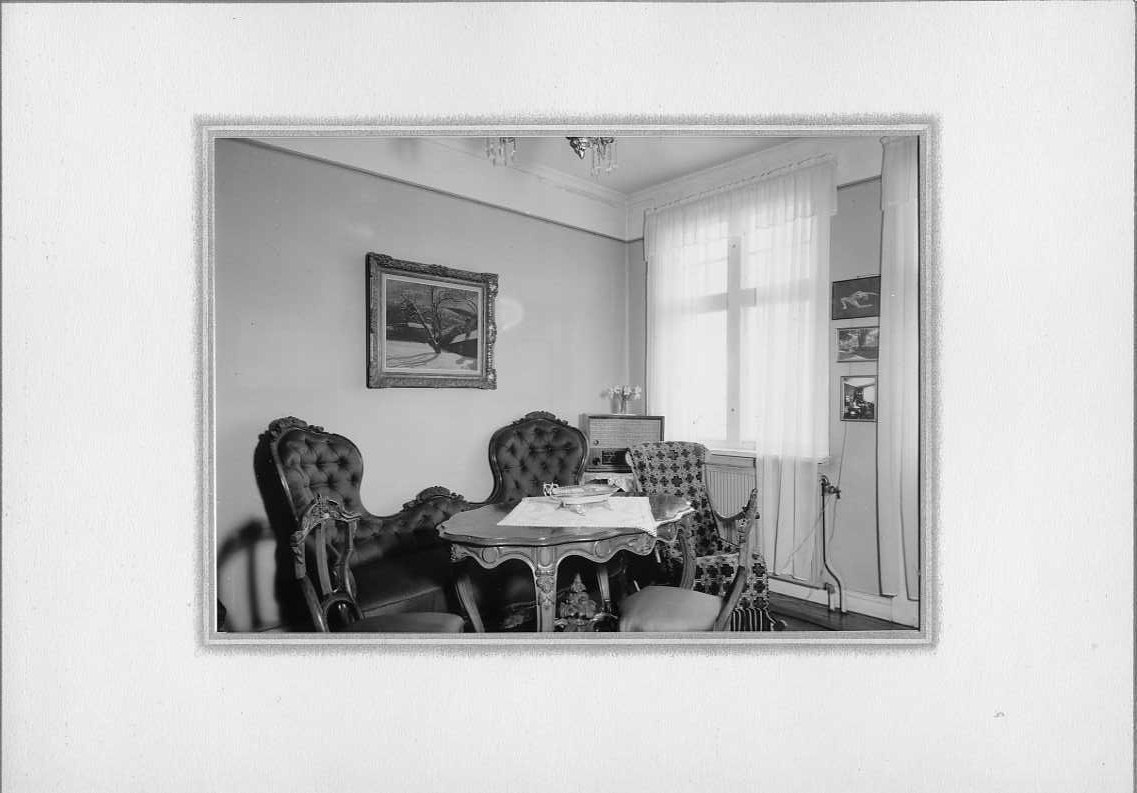 Interiör från änkefru Anna Malmborgs hem. En soffgrupp med soffa, fåtölj, bord, stolar och gungstol. I hörnet står en radioapparat på ett bord. Två fönster med ljusa, tunna gardiner. På en smal vägg däremellan hänger tre fotografier/bilder, bland annat en danspose med dottern Astrid Malmborg. På väggen ovan soffan hänger en målning av Annas make, konstnären Pelle Malmborg, med ett motiv från Gränna.