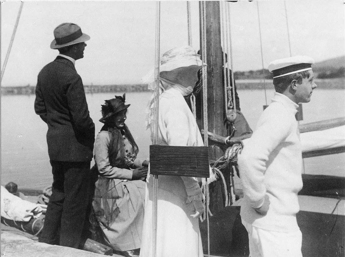 Kronprinsparet Gustav Adolf och Margaret till vänster på von Dübens motorseglare Blenda. I mitten med flor för ansiktet står Mary Lambert, gift von Düben. Sjömannen till höger är möjligen Wahlberg.