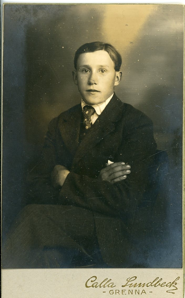 Porträtt av en okänd pojke i tonåren. Han bär randig skjorta och slips, sitter med armarna i kors.