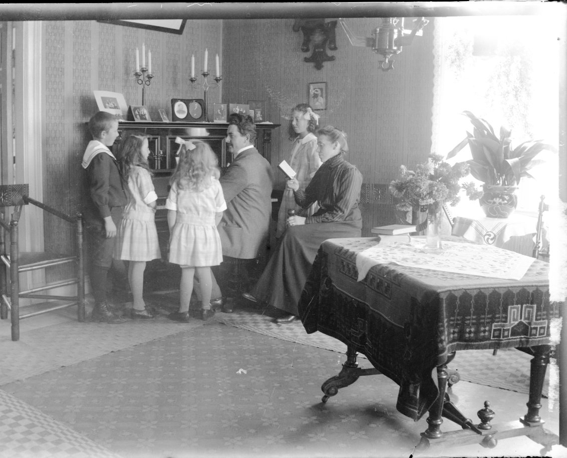 Barn är samlade runt en man som spelar piano. En kvinna sitter bakom med en liten uppslagen bok framför sig.