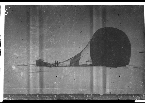 Oretuscherad. Ballongen Örnen har landat, 14 juli 1897. Troligen Nils Strindberg till vänster och S A Andrée till höger.
