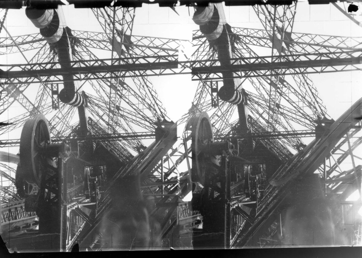 Sannolikt från Eiffeltornet. Bild tagen uppåt. Fotografen själv, N Strindberg, i bildens nederkant? Stereobild. Påsiktsbild från nitratnegativ.