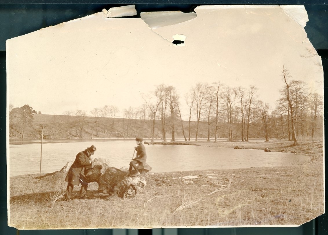 En man med hög och en liten pojke med en pinne i handen. Pojken sitter på vad som ser ut att vara del av ett träd. Han sitter vänd mot mannen som står hukad över sannolikt en lådkamera som står på andra änden av trädet, han ska ta kort på pojken. De befinner sig hitom ett vattendrag.