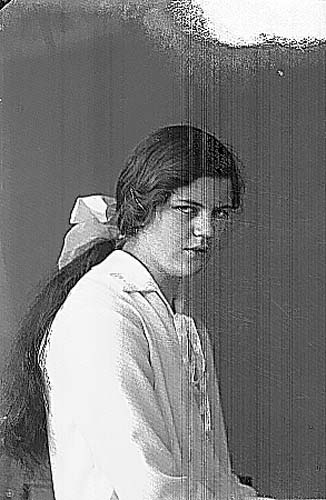 Asta Jansson, lite från sidan, med långt mörkt hår med hårband med rosett. Troligen i anslutning till konfirmation.