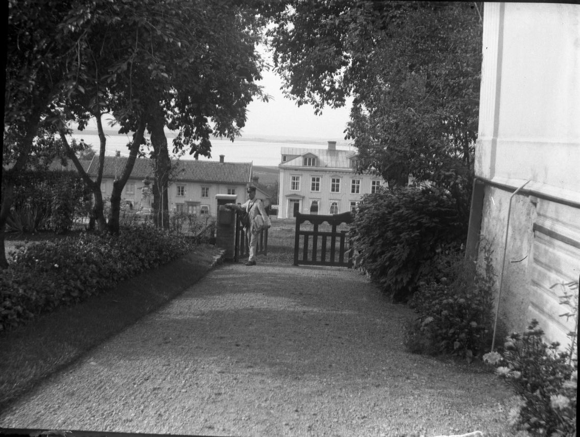 Från Borgmästargårdens trädgård ut mot torget. Vid den öppna grinden står sannolikt brevbäraren. På andra sidan torget syns bebyggelsen utmed Brahegatan.