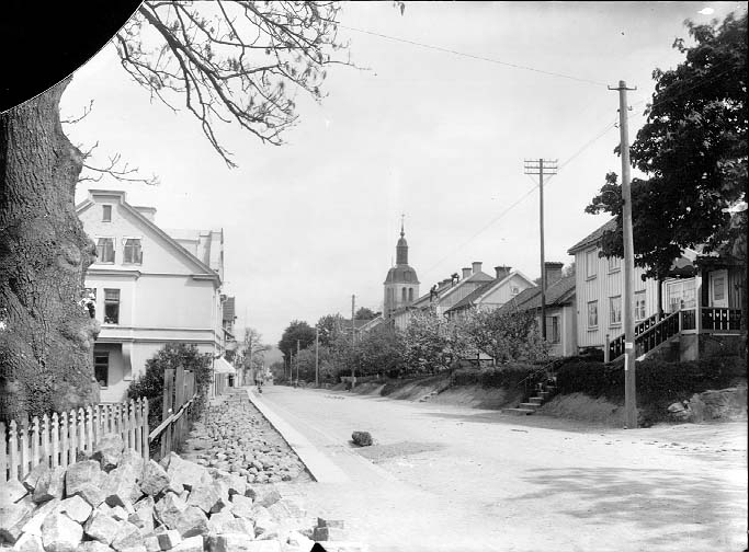 Infarten till Gränna vid f d Söder tull. Stensättning av västra trottoaren, en rad med borgmästarsten. Närmast i bild till vänster Brahegatan 3. Till höger Brahegatan 2-4.