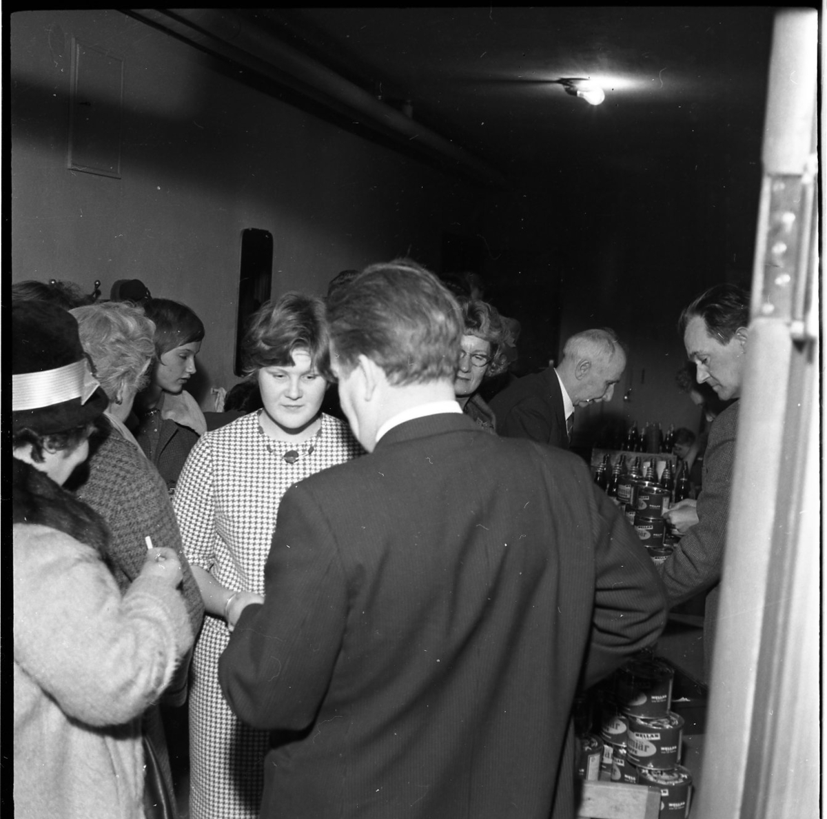 Kvinnor och män vid ett lottstånd, troligen. Den unga kvinnan i klänning med hundtandsmönster är Ewa Heldebrandt.