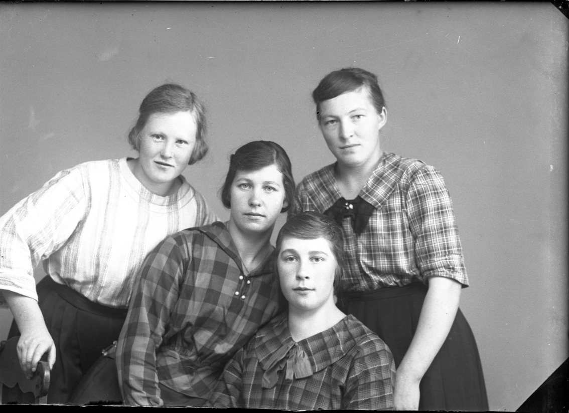 Gruppbild med fyra flickor/unga kvinnor tätt tillsammans. Tvåa från vänster är Hilma Carlsson från Hestra, Vireda.