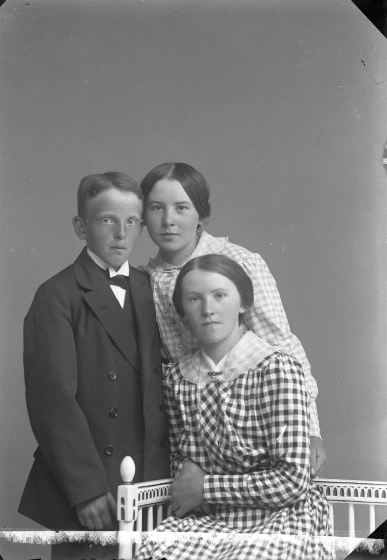 Gruppbild med en pojke och två flickor som står tätt intill varandra, sannolikt syskon.