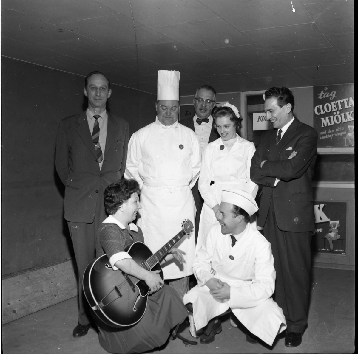 En grupp människor står uppställda för fotografering. De tittar på varandra och skrattar. Vissa bär kavajer, andra bär serveringskläder och kockmössor. En kvinna håller i en gitarr