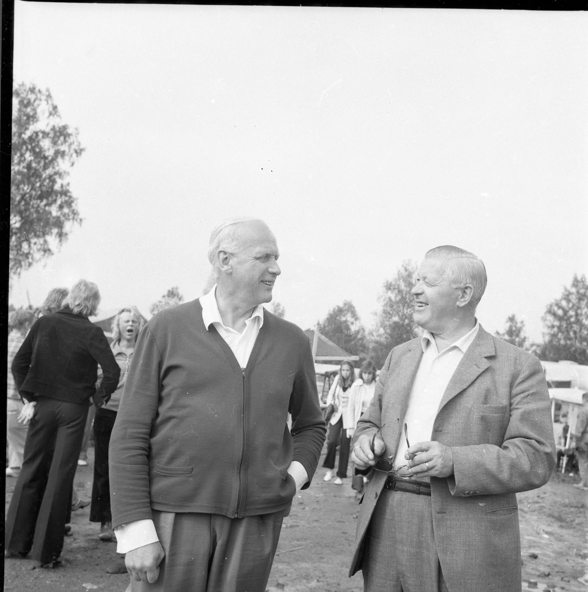 Två män samtalar på ett marknadsområde.