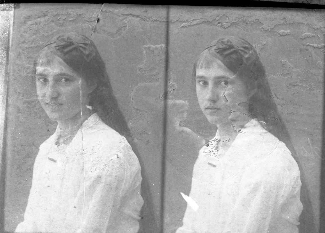 Bröstbild av en ung kvinna. Två bilder på samma glasplåt.