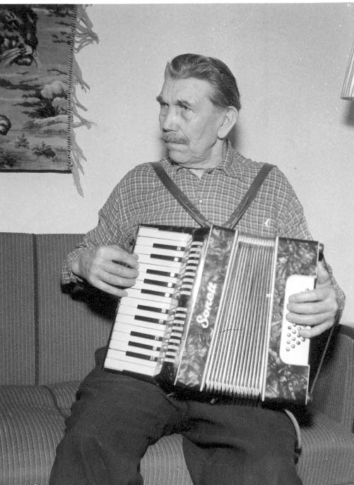 Porträtt av David Larsson från Mogata. Han sitter i en soffa och spelar på ett dragspel. En bonad hänger på väggen bakom honom.