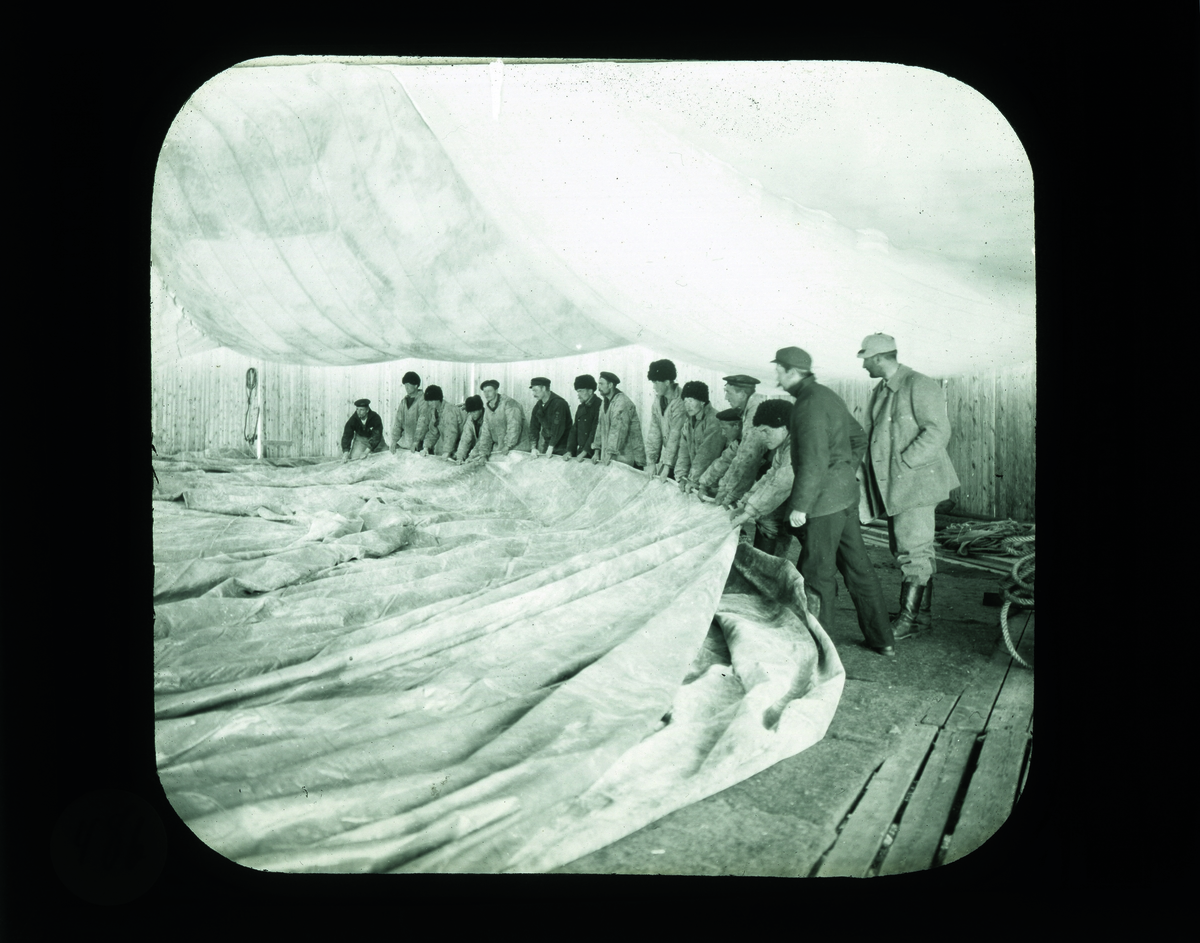 Ballongen läggs ut i ballonghuset. Knut Fraenkel till höger och Alexis Machuron i mörk klädsel.