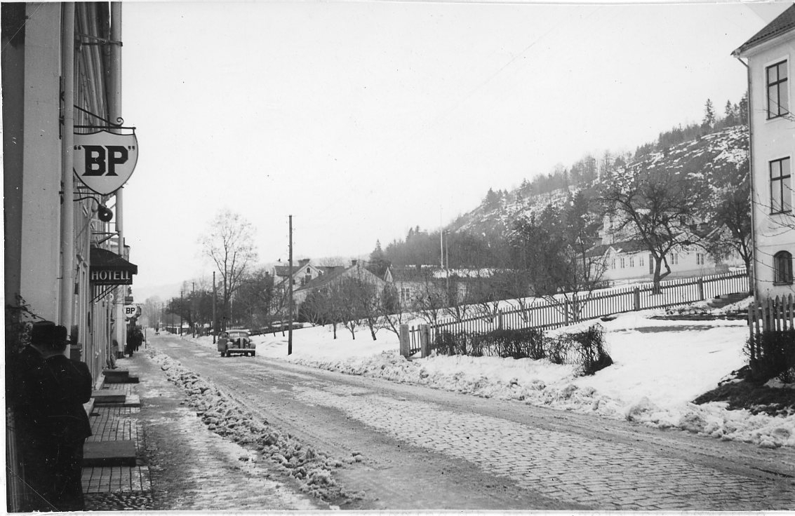 Brahegatan i Gränna en vinterdag med snöslask i vägkanten. Hotell Brahe till höger med skyltar för "BP". "Vättermuseet" upp till höger. En bil står parkerad lite längre bort på gatan.