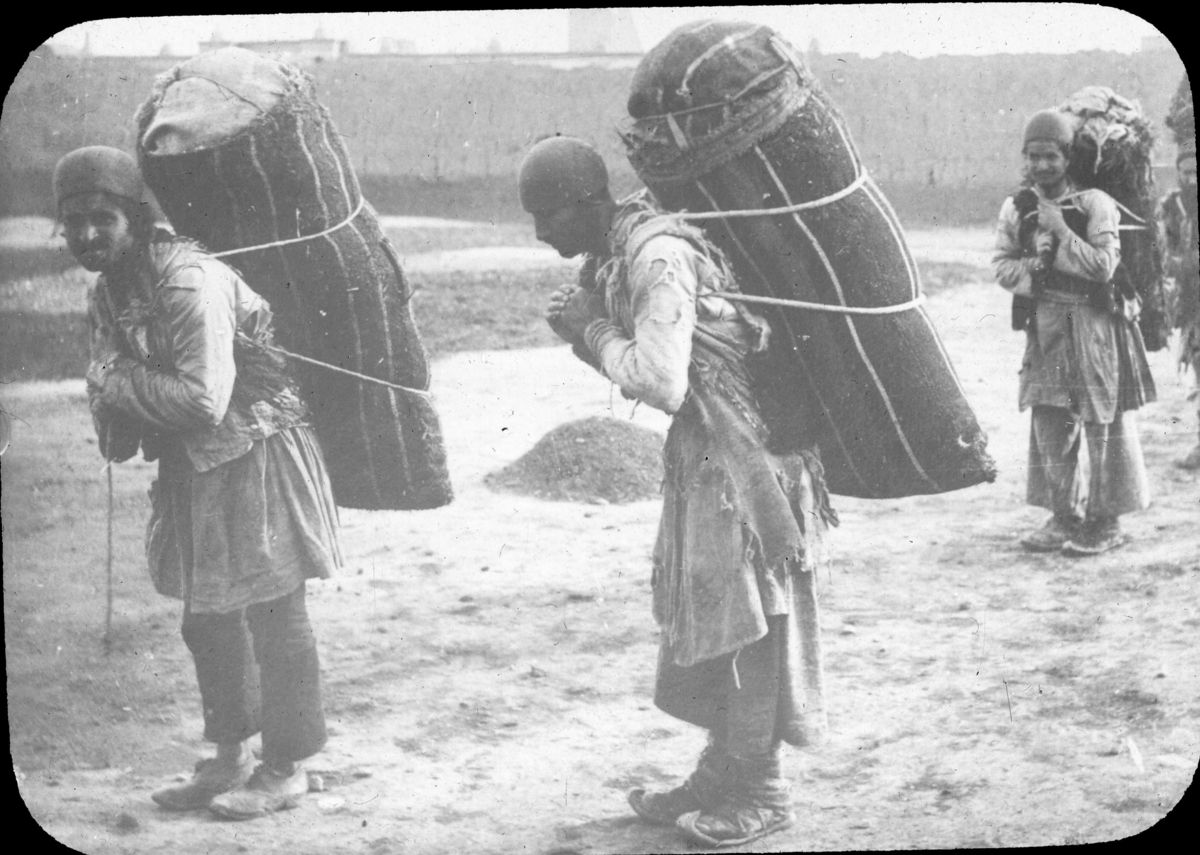 "Gatubild i Teheran (persiska stadsbud)". Fyra personer med packning på ryggen.