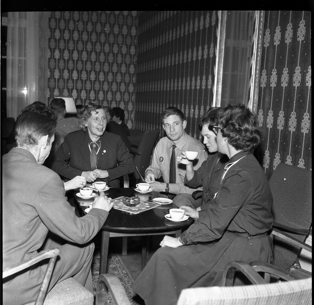 Män och kvinnor, några i scoutdräkt, sitter i grupper runt bord med kaffekoppar.