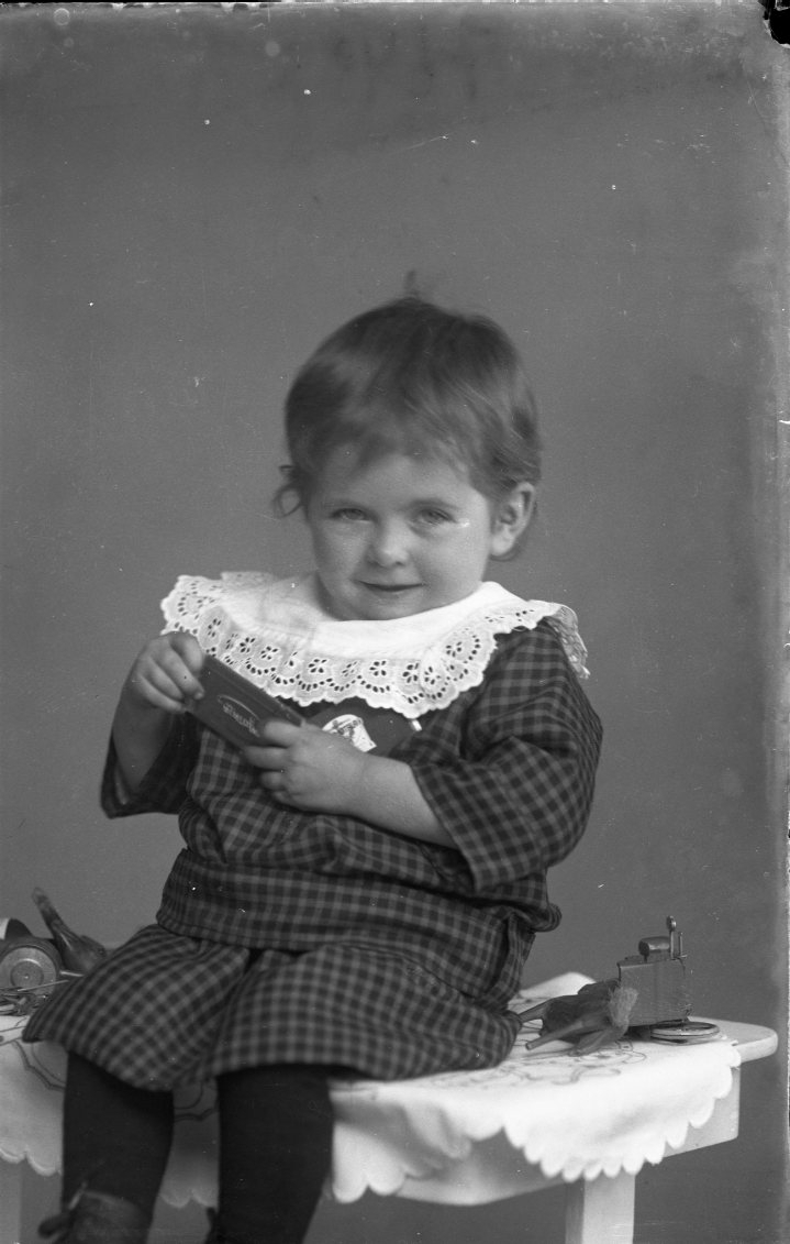 Porträtt av en liten pojke som sitter på ett lågt bord. Leksaker i på bordet i händerna.