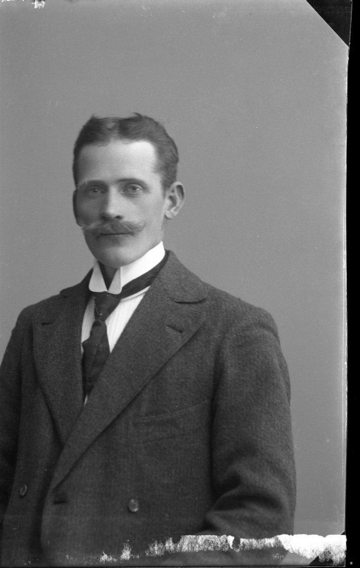 Porträtt av en mustaschprydd man.