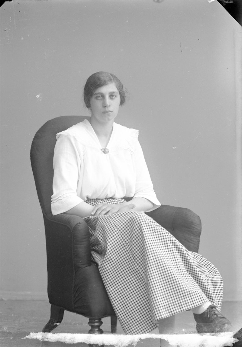 En ung kvinna i smårutig kjol sitter i en fåtölj.