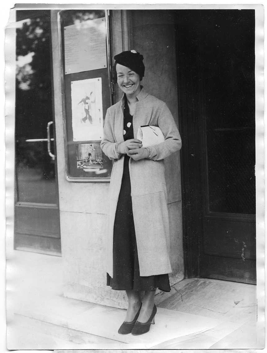 En skrattande kvinna med liten hatt och ljus handväska under vänster arm står vid entrédörrar till en scenlokal, troligen.