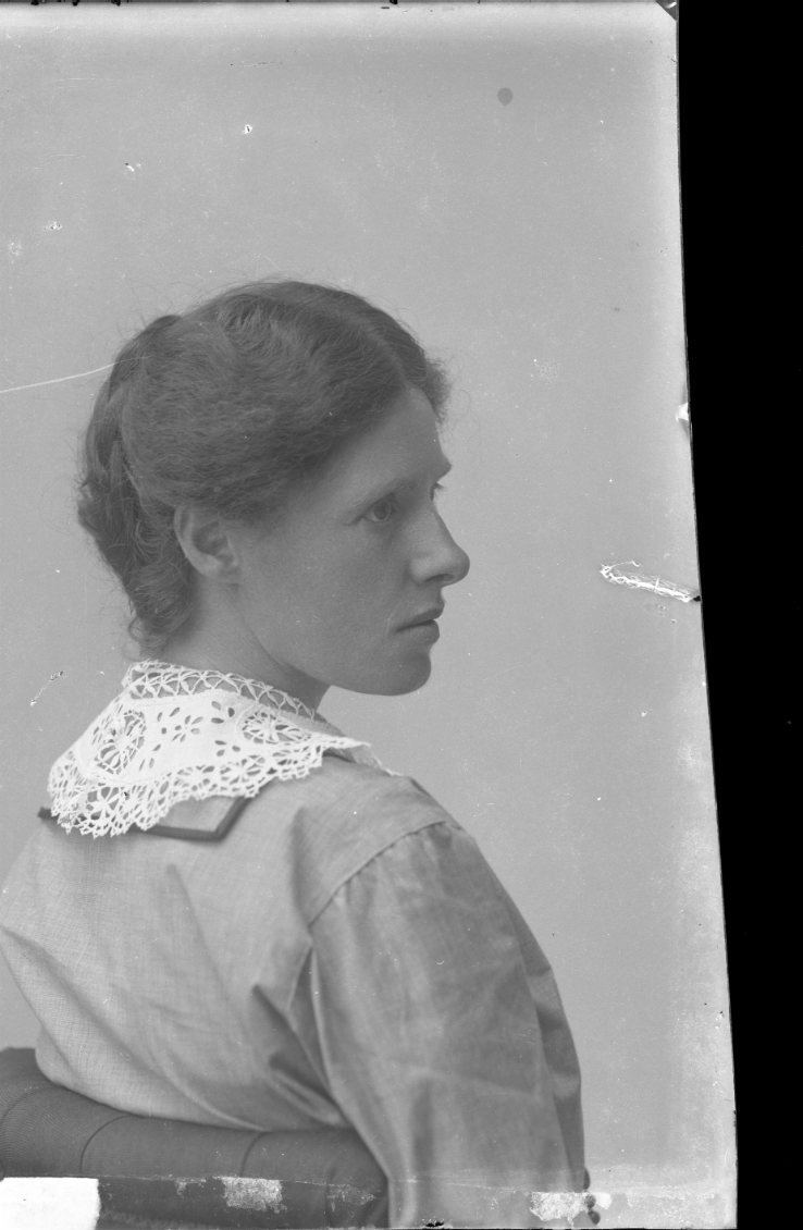 Porträtt av en ung kvinna med spetskrage. Fotograferad snett bakifrån med ansiktet i profil.