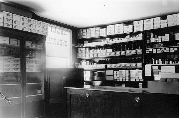 Interiör från Eklöfs skoaffär på Brahegatan i Gränna. Butiksdisk och vägghyllor med skokartonger och skoputs. I ett fönster till syns läser man inifrån "EKLÖFS SKOAFFÄR".