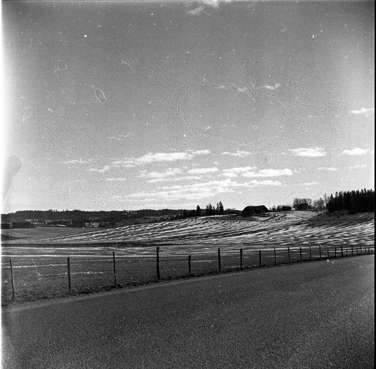 Vinterlandskap. Fotot är taget mot sydost i norra delen av Skärstad. Till vänster syns Deragården, Siringe och i horisonten till höger om mitten syns ladugården på Kullens gård, Siringe.