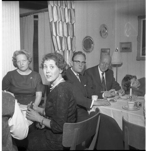 Kvinnor och män sitter runt fikabord. Det ligger en ung flicka på en soffa intill bordet.