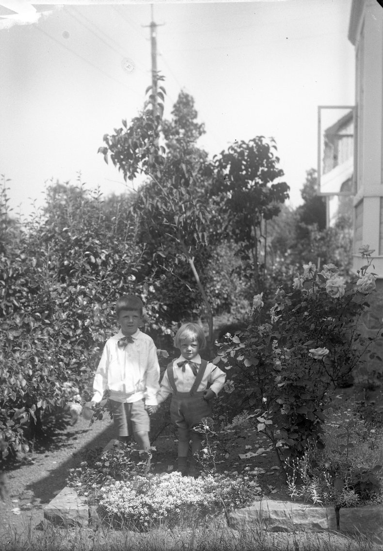 Barnen Sten och Lars Roman står i trädgården på framsidan av Bergsgatan 20. De håller varandra i handen.