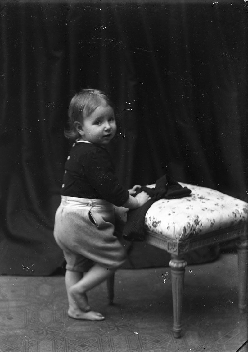 Porträtt av ett litet barn, barfota med knäkorta byxor, som står vid en pall med stoppad dyna.
