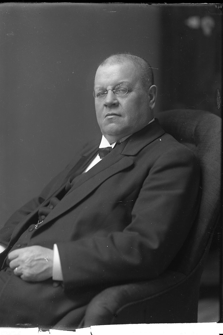 Porträtt av en sittande kraftig man i glasögon. Han tittar lite uppfordrande mot fotografen.